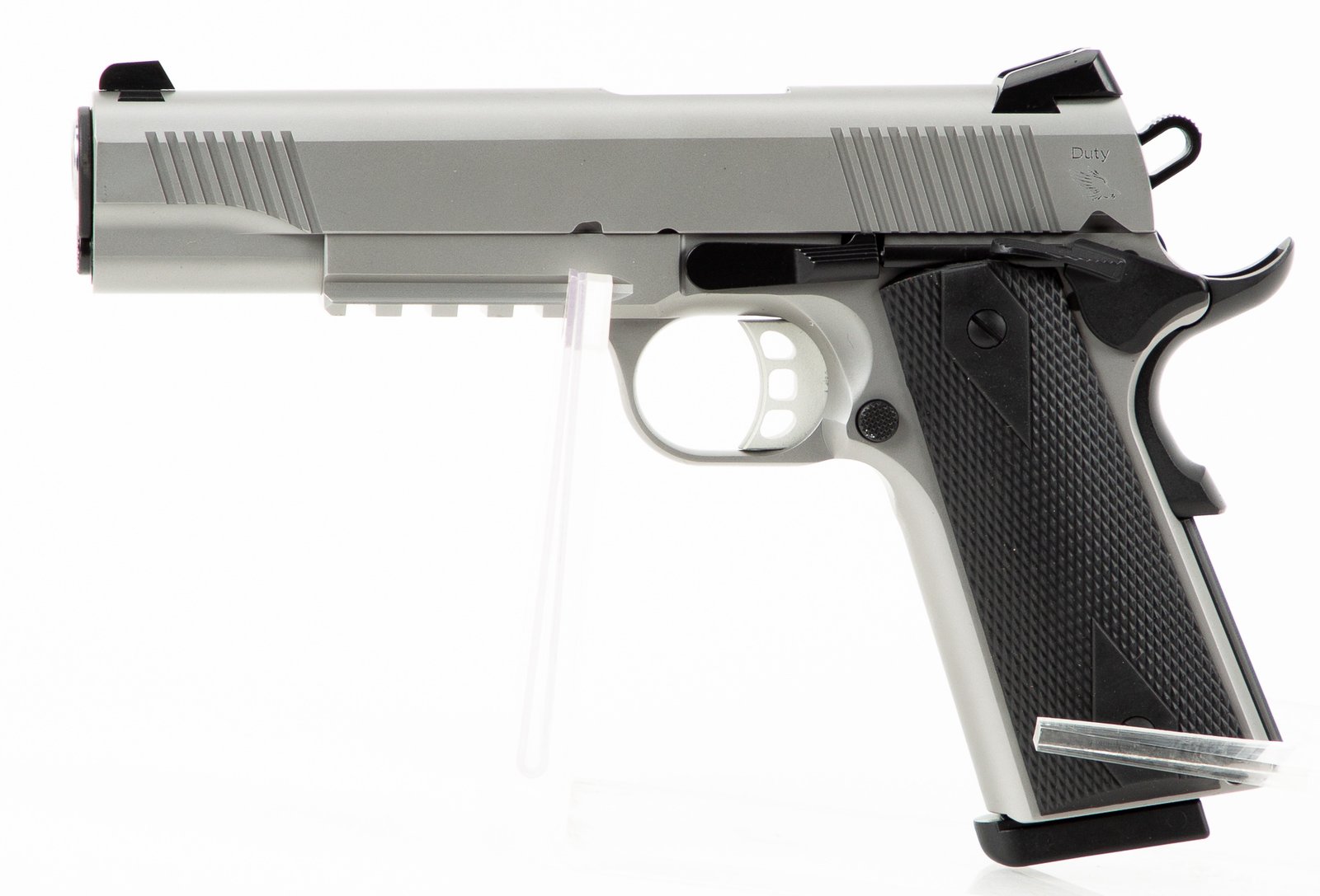 SDS 1911 Duty DSS45 .45ACP Stainless 5\” BBL. Upgraded features W Rail Finish: Stainless/Silver, Caliber: 45 ACP, Barrel Length: 5, Capacity: 8, Grips: Polymer, Type: Pistol, Action: Semi-Auto