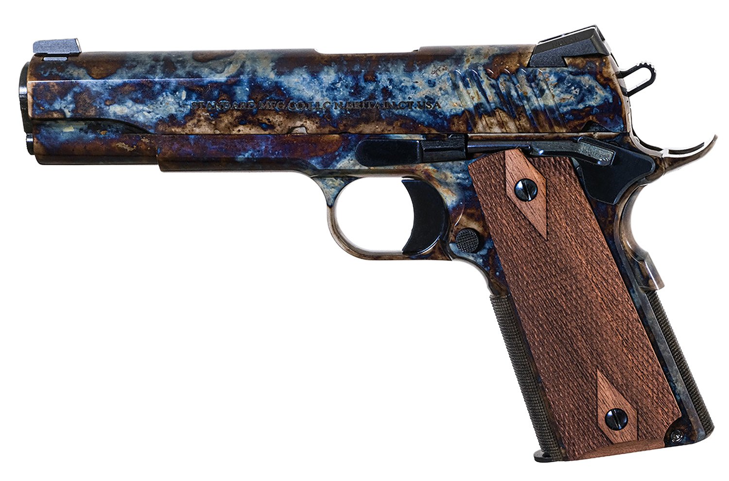 • Rosewood double diamond stocks Caliber: 45 ACP, Barrel Length: 5, Capacity: 7, Grips: Wood, Sights: 3-Dot, Finish: Case Hardened, Type: Pistol